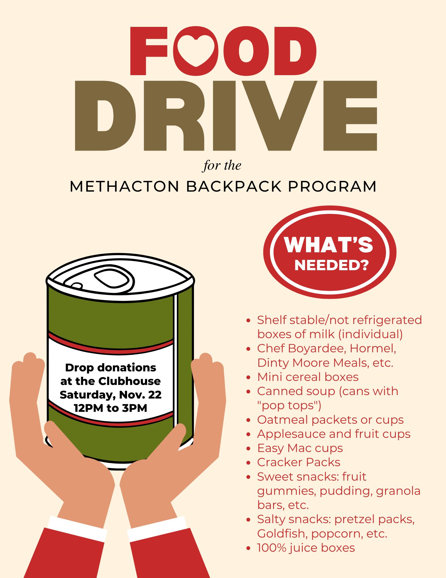 Methacton Backpack Program. Donations can be brought to the clubhouse on Saturday, 11/22/2025 between 12 PM and 3 PM. If you are unable to donate on this date, but would still like to contribute, please bring your donation items to the Annual Meeting on November 20th, from 6 PM - 8 PM, in the Clubhouse. Further details can be found on